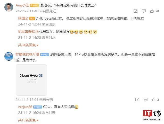 在用户的期待中,小米手机系统软件部总监张国全通过微博透露了小米14 ultra手机稳定版内测系统的更新进展。他表示,14u的beta版已经发布,而稳定版正在内部测试中,若无重大问题,预计下周即可推送。