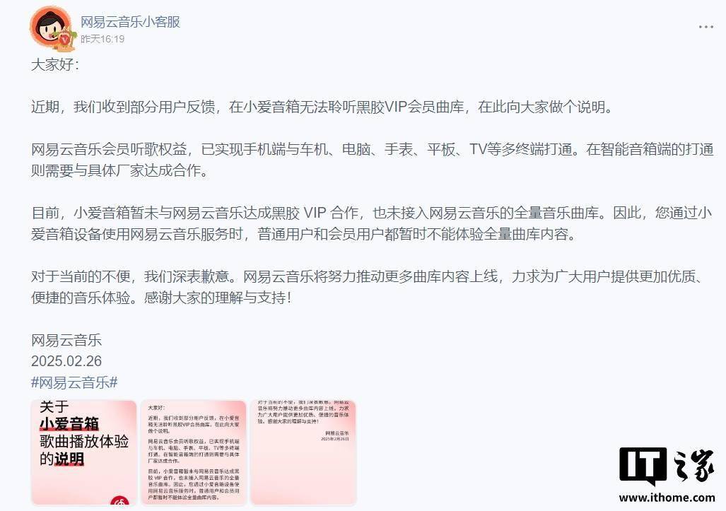 通知指出,近期网易云音乐收到了不少来自小爱音箱用户的反馈,反映他们无法在小爱音箱上播放网易云音乐的黑胶vip会员曲库。对此,网易云音乐给出了正式回应。