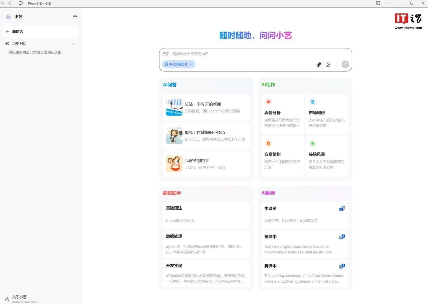 经过实测,网页版小艺智能助手已经完美适配了手机和pc的布局,为用户提供了多样化的功能,包括ai问答、ai写作、编程助手以及ai翻译等。网页版小艺还支持r1深度思考功能,用户可以根据需求自定义自动或强制进行深度思考。