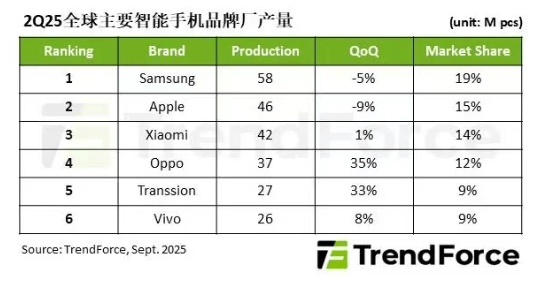 三星电子凭借5800万部产量稳居榜首,占据19%的市场份额,但较上季度下降5%。苹果公司以4600万部产量位列第二,市场份额15%,同样出现9%的季度下滑。不过值得注意的是,苹果年度产量同比增长4%,主要得益于上半年推出的iphone 16e机型在市场上的强劲表现,该机型有效填补了新旧产品交替期的市场空白。