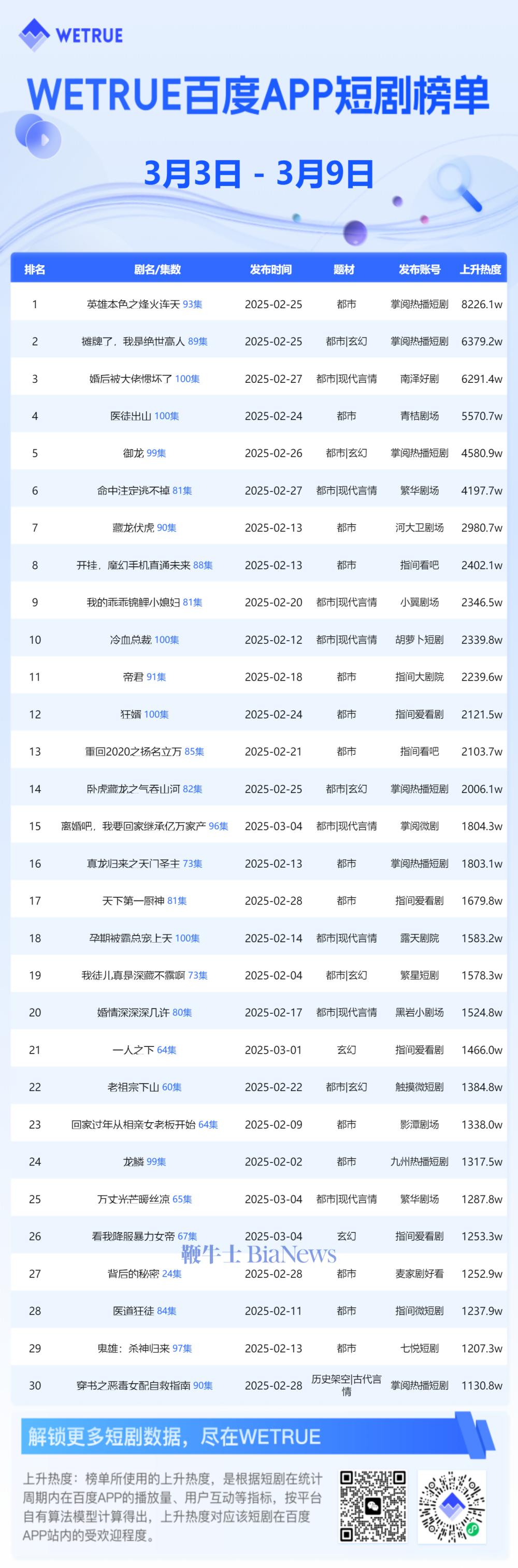 本次发布的榜单聚焦于百度app平台上的短剧内容,具体为一周热度榜单,数据覆盖的时间段为3月3日至3月9日。这一时间段内的短剧表现将通过榜单得以直观呈现。