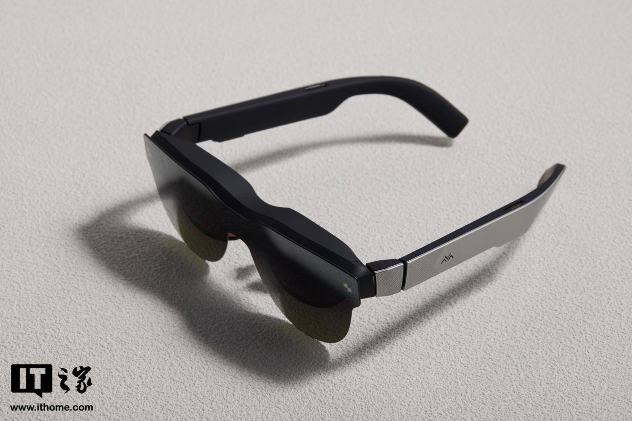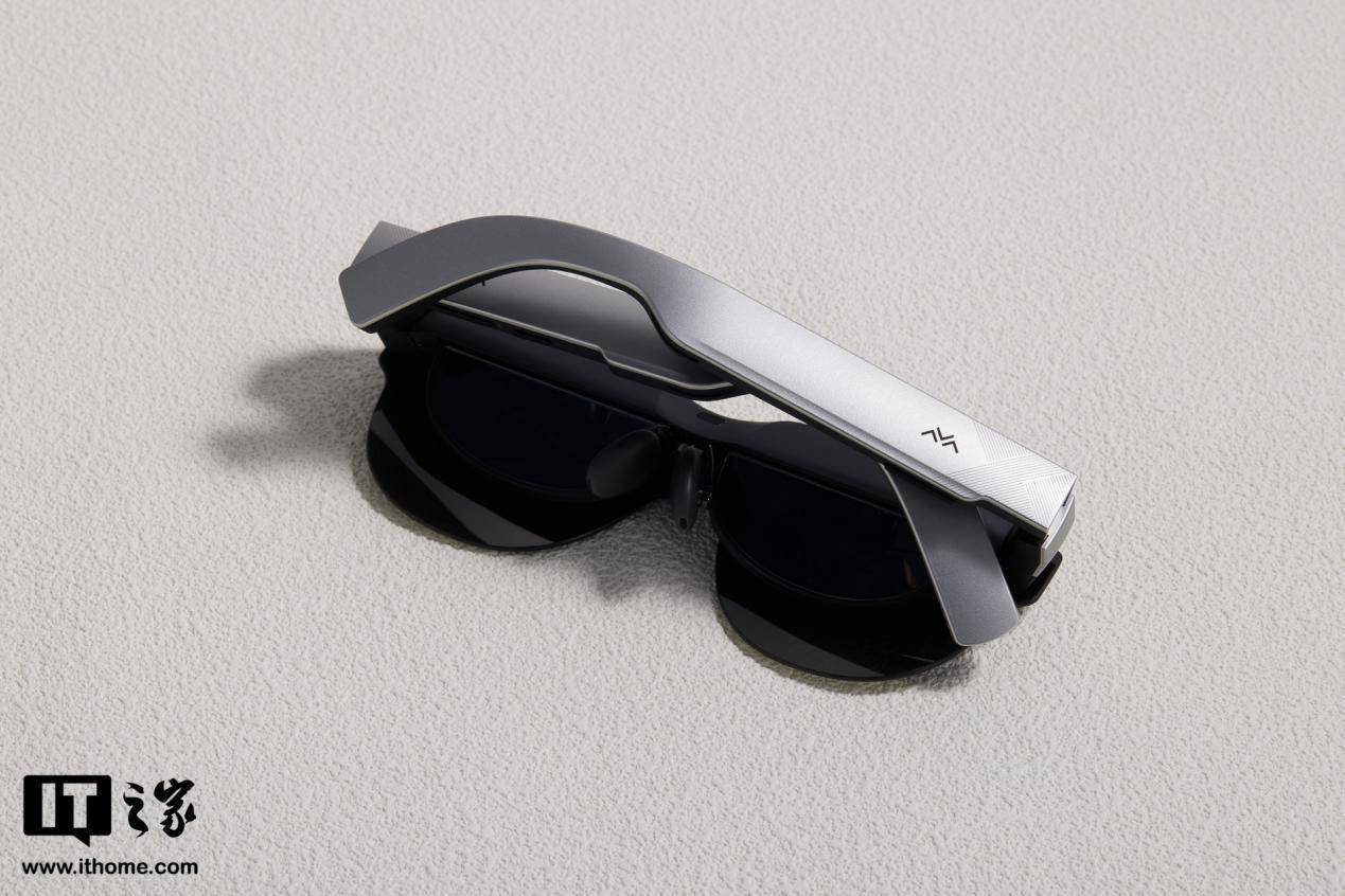拉开收纳包,就能看到眼镜本体了。雷鸟 air 3 ar 眼镜的整体大小只比普通的墨镜大一些,整个设计同样是精致轻巧,很有科技感。