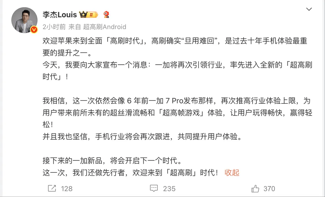 一加中国区总裁李杰近日通过社交平台发文,针对苹果新机适配高刷新率屏幕的现象发表观点。他指出,高刷新率技术带来的流畅体验具有显著提升,用户一旦适应便难以回归传统屏幕,这项特性已成为近十年智能手机交互体验的关键突破之一。
